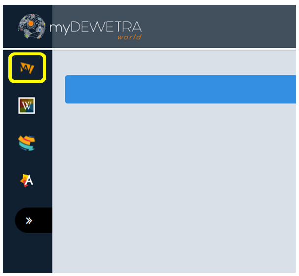 The user is then prompted to the next tab (dashboard) in which the applications available in the portal are shown. To enter Dewetra 2.0 (Web-GIS tool, functioning as frontend of Saint Lucia Hydromet Portal) users have to click on the icon (a black W on orange background) in the sidebar - upper left of the screen (highlighted in yellow)
