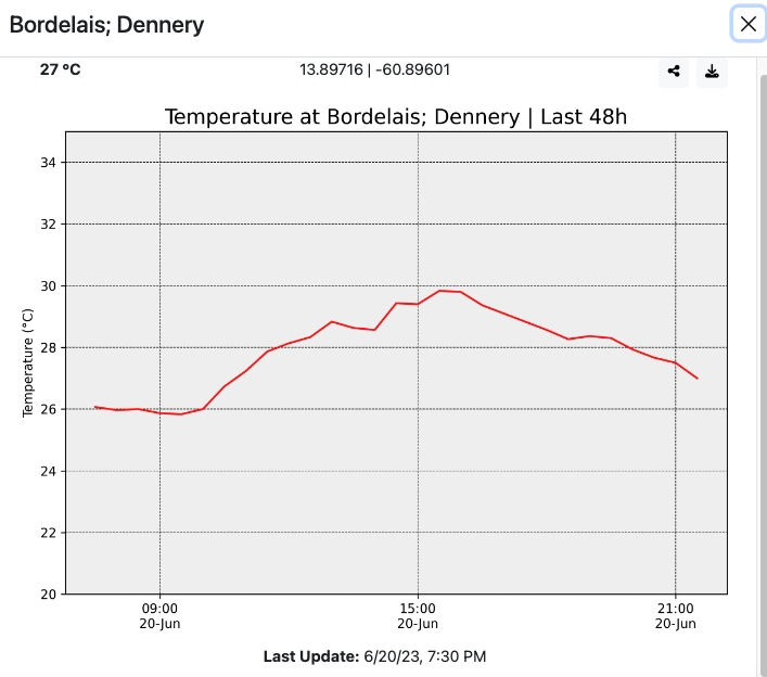 By clicking on the dedicated icon on the top-right corner, plots can be shared on multiple channels and data can be downloaded as csv table.