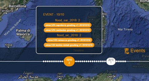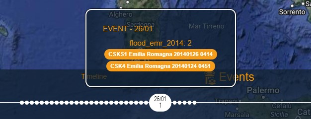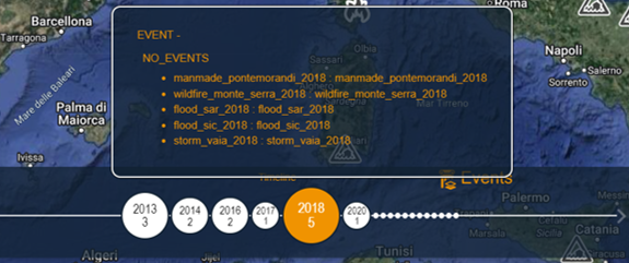 When users press the Events button, the system displays the “timeline” in the lower part of the screen and the available datasets on the map (see the figure below)