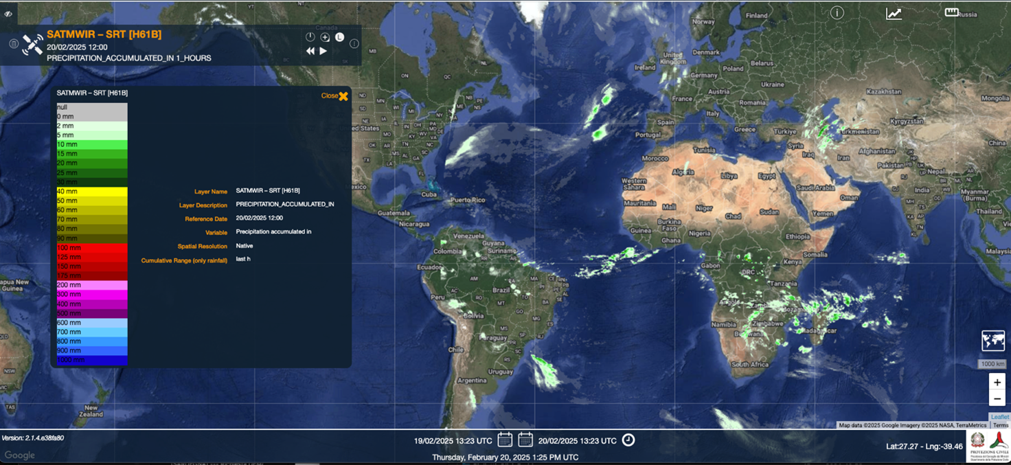 Accumulated Precipitation at ground by blended MW and IR. Near-real time product H61B integrates the instantaneous precipitation maps generated by P-IN-SEVIRI-PMW product (based on inter-calibrated Level 2 PMW instantaneous precipitation rate estimates blended with 10.8 μm channel from SEVIRI instrument). The integration is performed providing hourly the 1 hour accumulated precipitation and every six hours (at 00, 06, 12 and 18 UTC) the 24 hour accumulated precipitation. For details see: https://hsaf.meteoam.it/Products/ProductsList?type=precipitation |