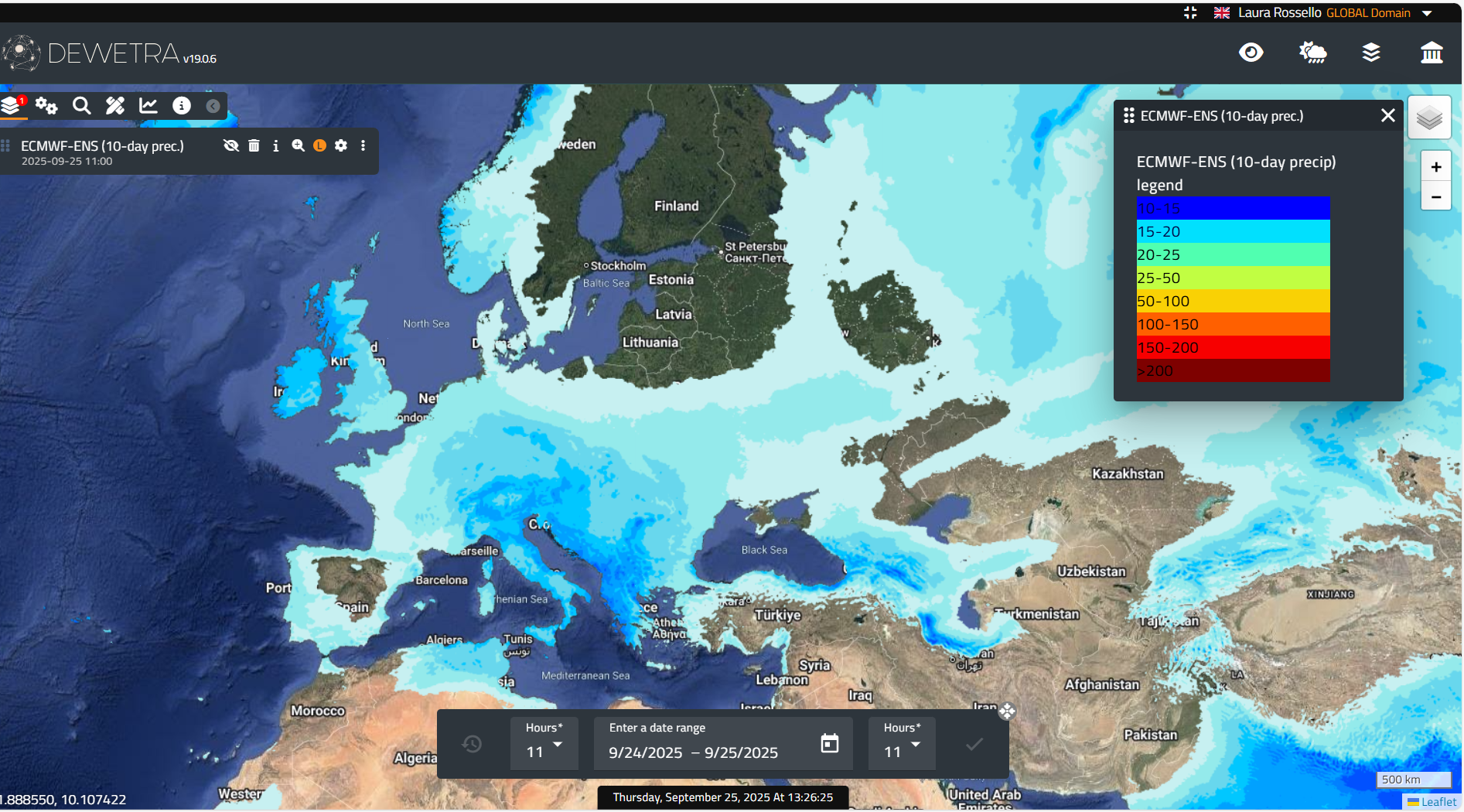| Available accumulations | Amount of accumulated rainfall over the forecast range of 10 days for the median of the ensemble ECMWF forecast; Probability [%] of exceeding 50-150-300 mm of accumulated rainfall over the forecast range of 10 days for the ensemble ECMWF forecast. |