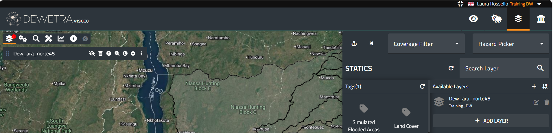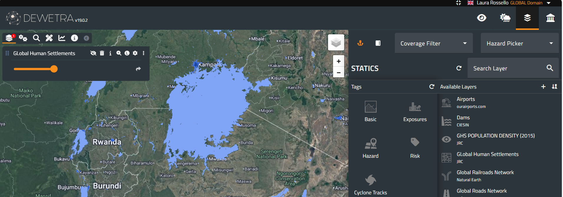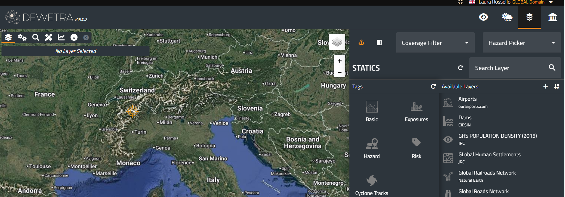 The third action button on the Toolbar is the Static Layers menu, which provides the user with access to all the time-independent data. Once the user clicks on the menu, a window appears. At the top, filters are available to refine the search for the desired layer: the coverage filter, hazard picker, and layer search.