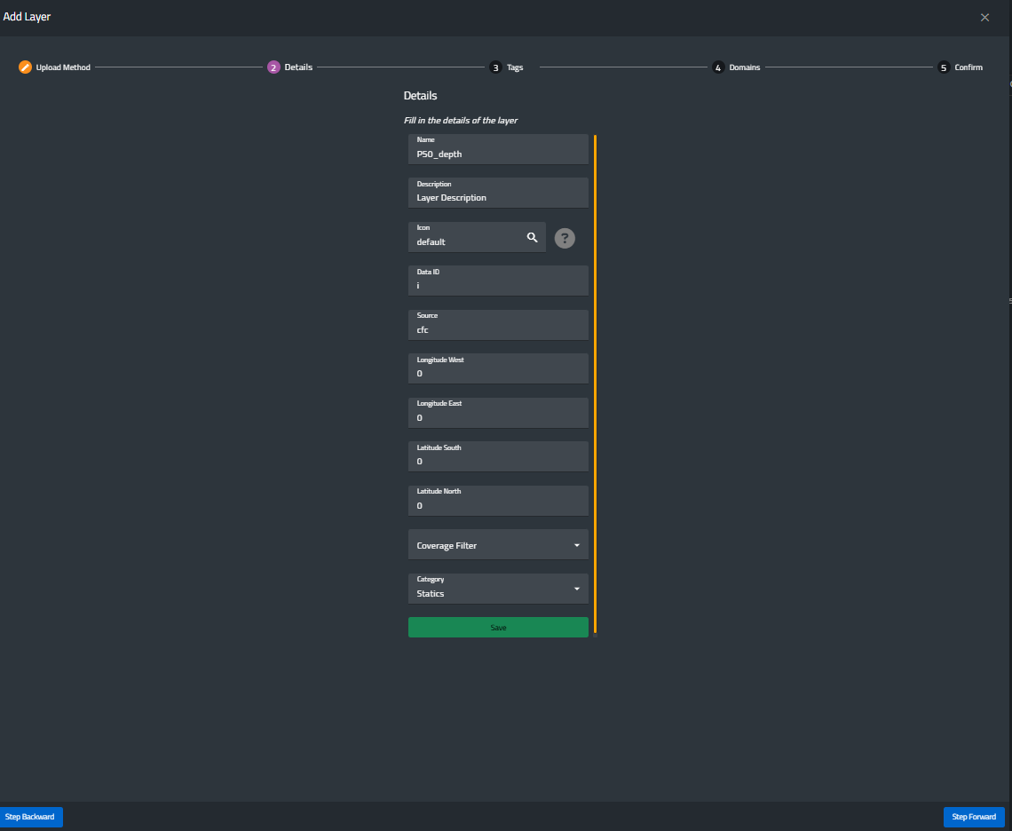 In the next step, users can define various characteristics of the layer, such as its name, description, icon, source, geographical extent, coverage filter, and category.