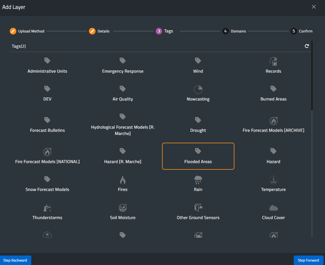 By pressing Save, the next step will appear. At this stage, users are asked to assign a tag to the layer. Tags must be chosen from the existing ones.