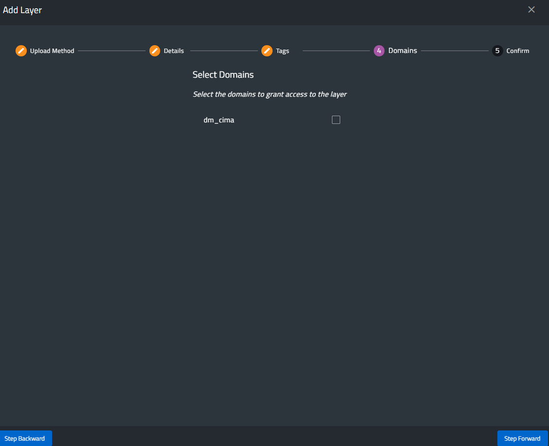 The layer will then be assigned to one or more domains. Please note that domains are strictly related to user permissions, meaning that specific users can add layers only for their own usage.