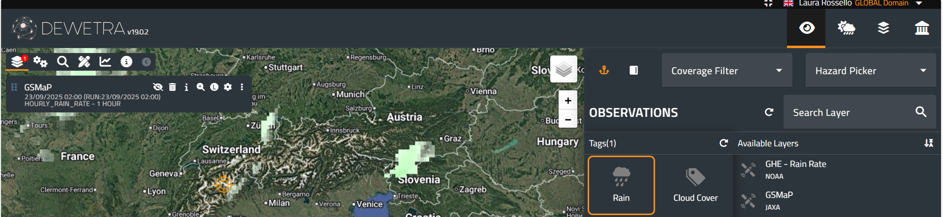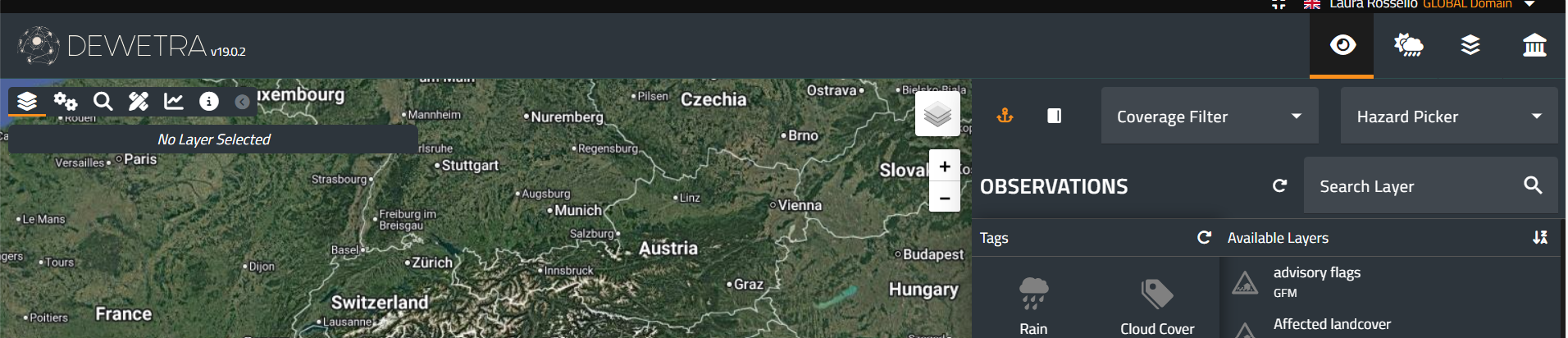 The first action button on the toolbar is the Observations menu, which provides the user with access to all observational datasets. Once the user clicks on the menu, a window appears. At the top, filters are available to refine the search for the desired layer: the coverage filter, hazard picker, and layer search.