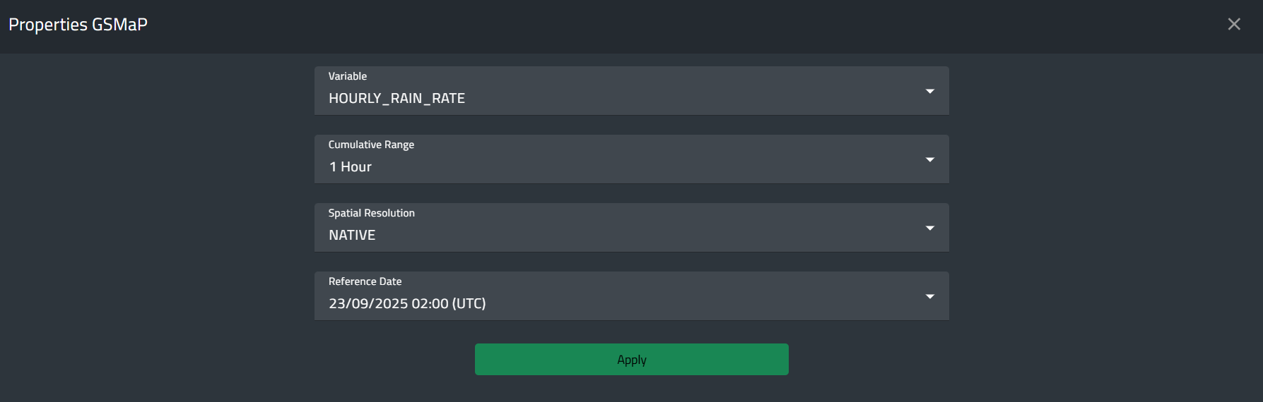 By left-clicking the layer name, users open the same Properties window, where they can edit the parameters of the loaded dynamic layer. These parameters may include, for example: spatial aggregation, accumulation period (if the variable is cumulative), time step, threshold values for data filtering, and the interpolation algorithm (if the variable is interpolated), etc.