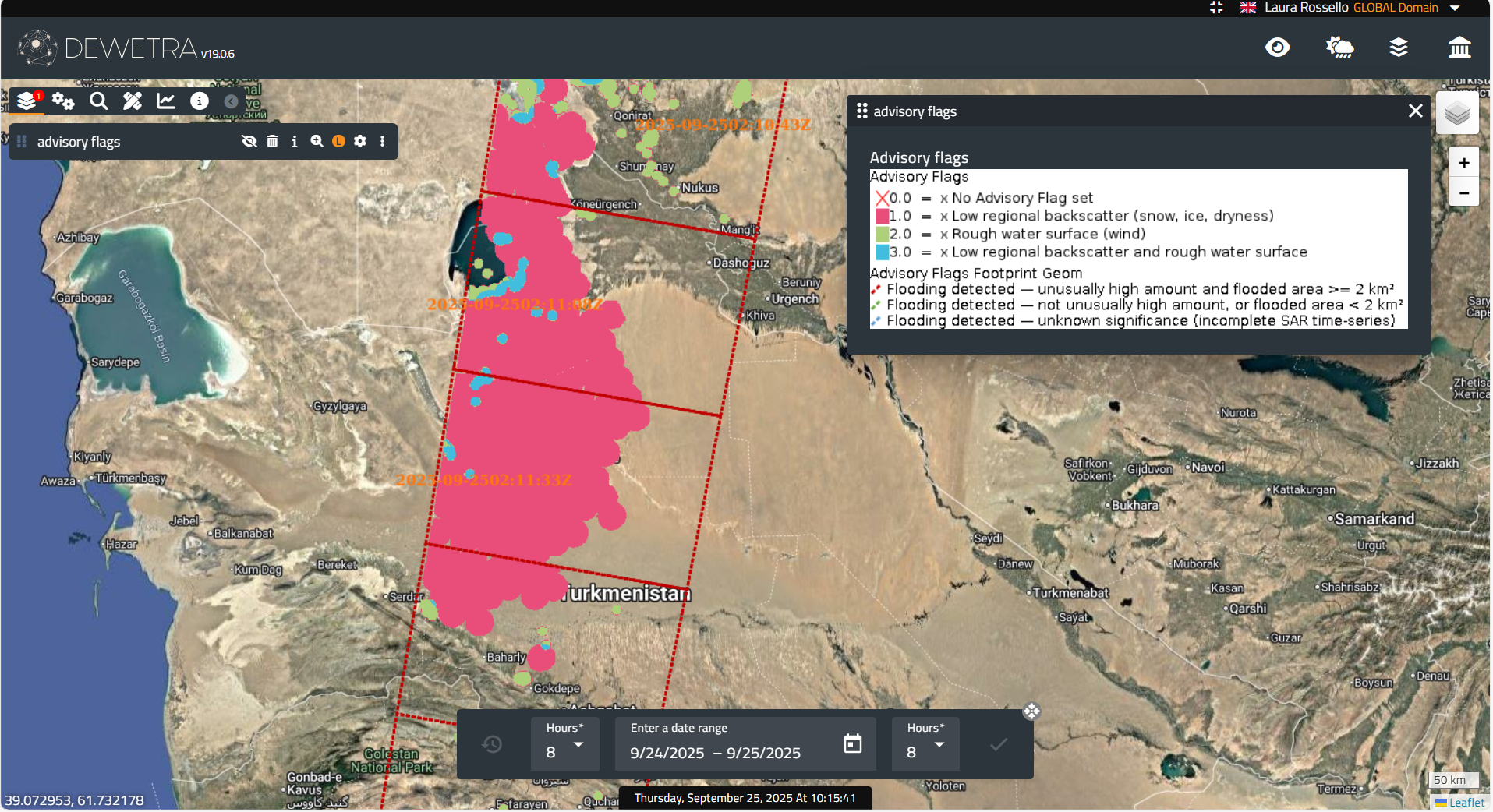 Pixels marked by the Advisory Flag are not excluded by the Exclusion Mask, but users are advised caution when using the observed water and flood extents over flagged areas. For each incoming Sentinel-1 scene that is input to the flood mapping algorithm, the advisory flag information will be generated during NRT runtime. After generating the Sentinel-1 observed water extent layer, the preprocessed 20m Sentinel-1 sig0 array will be analyzed and compared with the Calm Water Body signature database to obtain pixels holding Rough Water Surface. After the thresholding and spatial buffering, the obtained pixelmap that indicats regions that are potentially affected by wind is stored intermediately. As next step, the 20m-oversampled sig40 data from the corresponding (i.e. temporally matched) 25km ASCAT observation dataset is compared to the local ASCAT sig40 20th percentile value, which is pre-computed and accessed from the data cube. All pixels with detected Low Regional Backscatter are forwarded to the intermediate storage and the final Advisory Flag pixel map for the Sentinel-1 scene extent is computed. The Advisory Flag layer values are described below.