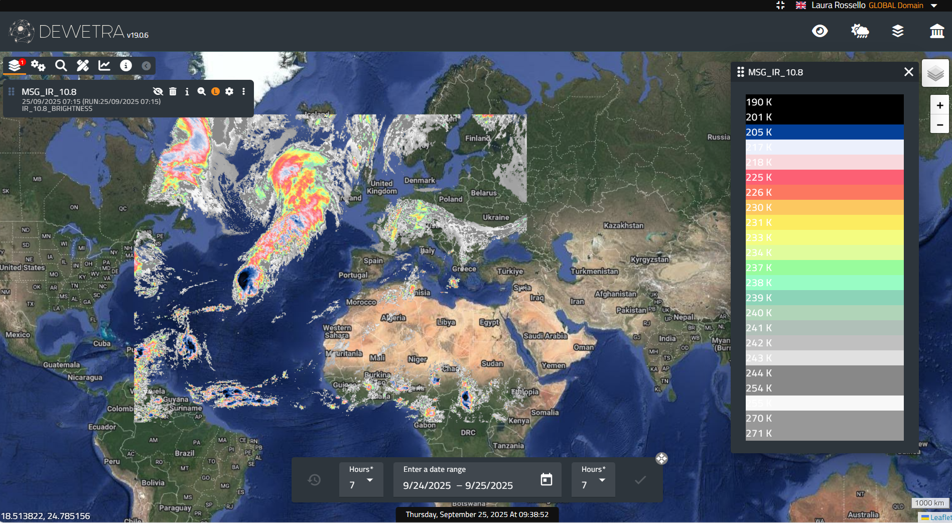 MSG (Meteosat Second Generation) is a joint effort of ESA (European Space Agency) and EUMETSAT and follows the success of the first generation Meteosat satellites. ESA is responsible for the design and development of the first satellite (now in orbit) and the assembling of the other three in collaboration with EUMETSAT. The first satellite, MSG-1 was launched in August 2002. MSG-2 was launched in December 2005. The others were launched later (2011-2013). Each satellite has a nominal lifetime of seven years. The third and fourth MSG satellite of the same design are provided to ensure service continuity until the end of the next decade. With the launch of MSG-2, two MSG satellites are operational in geostationary orbit, the first one operating at 0 degrees longitude on the west equatorial Africa while the other is the back up. The second generation MeteoSat is designed to meet the different needs of users interested in nowcasting applications and the development of numerical models for weather forecasts and will also provide important data for climate monitoring which will help to quickly-identify the weather events that could trigger devastating aftermaths. The second generation of Meteosat images resumes at longer wavelengths and narrower intervals than its predecessors, making it particularly suitable for short-term forecasts of unexpected and troublesome weather phenomena such as snow, thunderstorms and fog. By default, the system displays the last available image in the infrared channel (10.8µHz). the refresh time is 15 minutes with a spatial resolution of about 3km. More info at: MSG documentation on line |