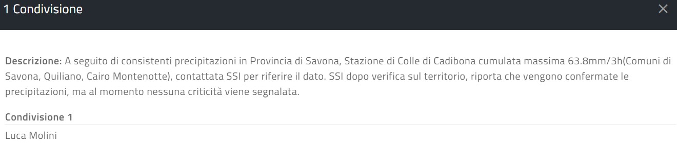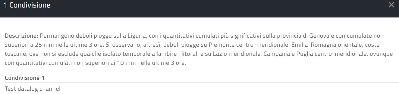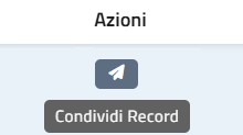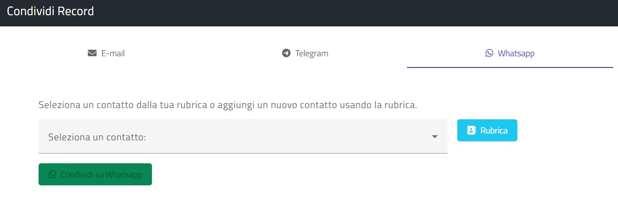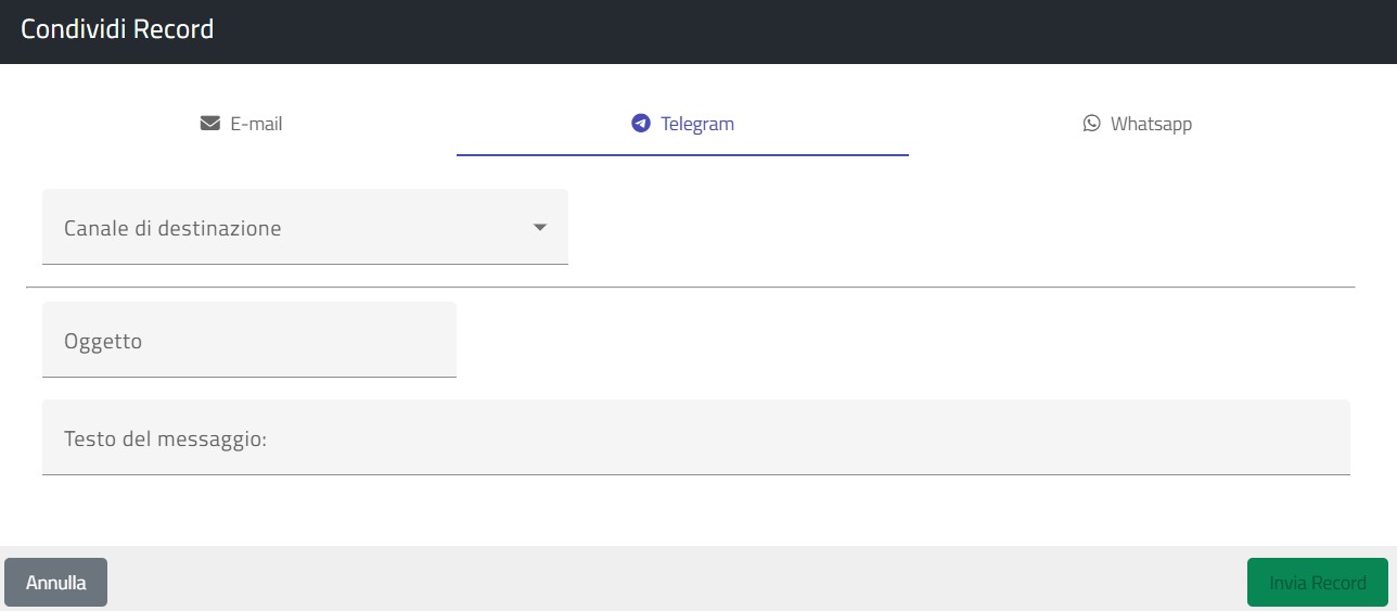 Per condividere un record all'esterno del perimetro della piattaforma, l'Operatore ha a disposizione tre diverse possibilità: inviarlo tramite email, Telegram oppure WhatsApp. Indipendentemente dalla modalità, per attivare la funzionalità, l'Operatore deve cliccare sull'icona “Condividi”