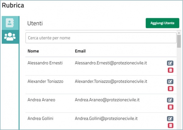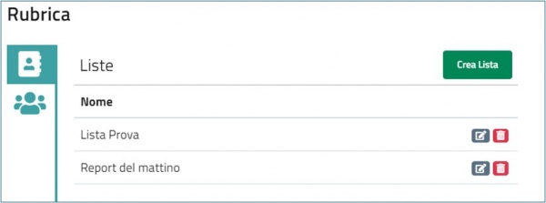Rubrica: consente all’utente di aggiungere creare mailing list ad hoc ovvero di aggiungere singoli indirizzi e-mail I pulsanti “modifica” (in grigio) ed “elimina” (in rosso) consentono, inoltre, di aggiornare le liste e i singoli indirizzi e-mail a seconda delle necessità.