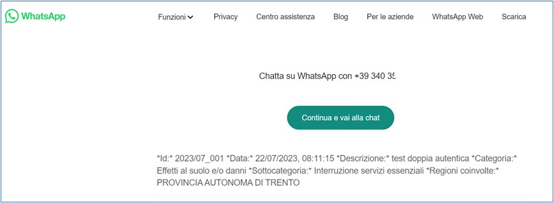 L'invio avviene tramite pressione del pulsante Condividi su WhatsApp, posto in basso a sinistra. Fatto cioò, il sistema aprirà una nuova finestra nel browser attraverso la quale l'operatore dovrà confermare l'invio del post su WhatsApp cliccando su "Continua e vai alla chat"