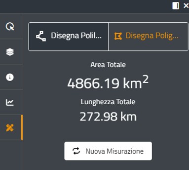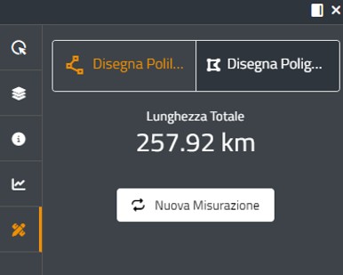 L’utente può decidere se disegnare una polilinea – retta o spezzata - ( che consente la sola misurazione della lunghezza, in km) o un poligono (che oltre alla lunghezza calcola anche l’area totale, in km2)