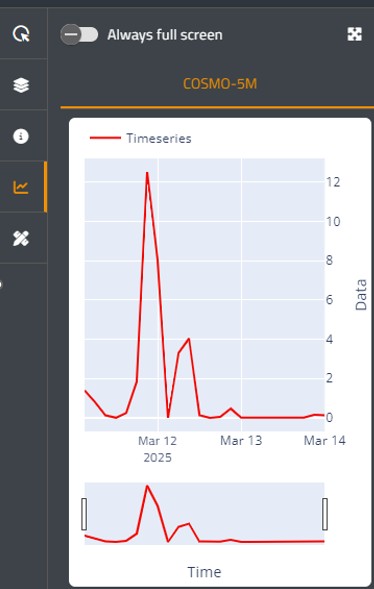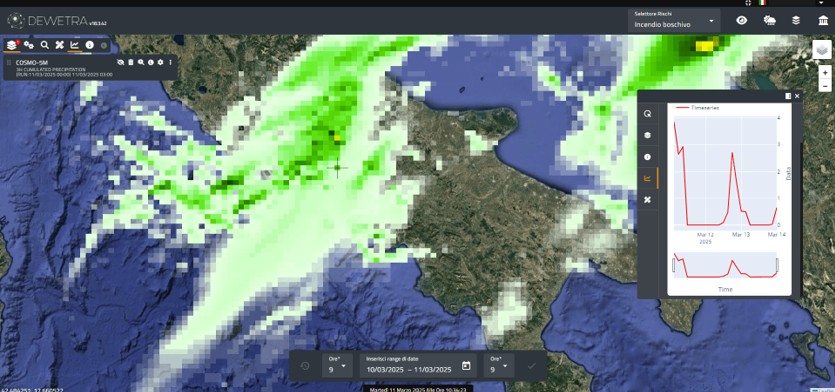 La funzione Serie Temporali applicabile solamente ai modelli di previsione e consente all'utente di visualizzare l'intera serie temporale degli ultimi 3 run modellistici disponibili per un singolo pixel o di un'AOI (in questo caso viene mostrata il valore medio calcolato sull'area).