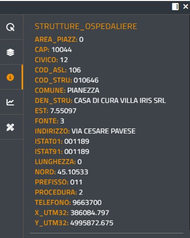 Nel caso invece la funzionalità Info venga impiegata su un layer statico, le informazioni mostrate nella finestra pop-up saranno tutti gli attributi disponibili a database per quello strato. A titolo di esempio, nella figura successiva viene mostrato il risultato visualizzato nel caso venga interrogato il layer Strutture ospedaliere.