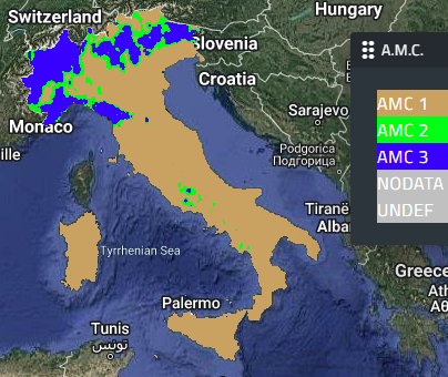 La mappa visualizzata rappresenta il valore di AMC (Antecedent Moisture Content): il dato è calcolato utilizzando la cumulata di precipitazione dei cinque giorni antecedenti che è confrontata con tre soglie. Se la cumulata di precipitazione sui cinque giorni precedenti nella cella è inferiore a 10 mm nella stagione dormiente (da Ottobre a Marzo) o a 35 mm nella stagione di crescita (da Aprile a Settembre) si è nel caso di AMC1, che equivale a suolo asciutto, ed è rappresentato nella palette in rosso; nel caso in cui il valore sia compreso tra 10 e 30 mm nella stagione dormiente o 35 e 50 nella stagione di crescita si è nel caso di AMC2, che equivale a suolo medio, ed è rappresentato nella palette in verde; infine se il valore di cumulata supera i 30 mm nella stagione dormiente o i 50 nella stagione di crescita si ha AMC3, che equivale a suolo saturo, ed è rappresentato nella palette in blu. Si ha un dato giornaliero[1], che può però essere visualizzato in diverse aggregazioni spaziali: l’indice può, infatti, essere visualizzato nella sua risoluzione nativa (3.5 km), o aggregato su comuni, province, regioni, aree di allertamento, zone di vigilanza meteo-climatica o bacino idrografico. |