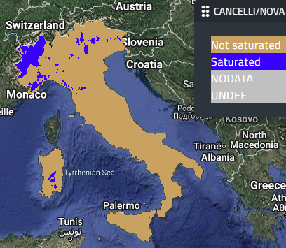 La mappa visualizzata rappresenta l’indice di <Cancelli-Nova[1]: in ogni punto del dominio la cumulata di precipitazione dei 15 giorni precedenti viene confrontata con una soglia di riferimento. Nella metodologia è definita una soglia per ogni area di allertamento, quindi la cumulata di precipitazione nella cella è confrontata con la soglia dell’area di allertamento a cui appartiene. Nel caso in cui la cumulata superi la soglia nell’arco dei 15 giorni la cella si considera satura, che corrisponde al blu nella palette, mentre se non si ha superamento la cella si considera non satura, che corrisponde al rosso nella palette. Si ha un dato giornaliero[2], che può però essere visualizzato in diverse aggregazioni spaziali: l’indice può, infatti, essere visualizzato nella sua risoluzione nativa (3.5 km), o aggregato su comuni, province, regioni, aree di allertamento, zone di vigilanza Meteo o bacino idrografico. Per le aggregazioni spaziali, se una cella che ricade nell’area è satura, tutta l’area di riferimento risulta essere satura. |