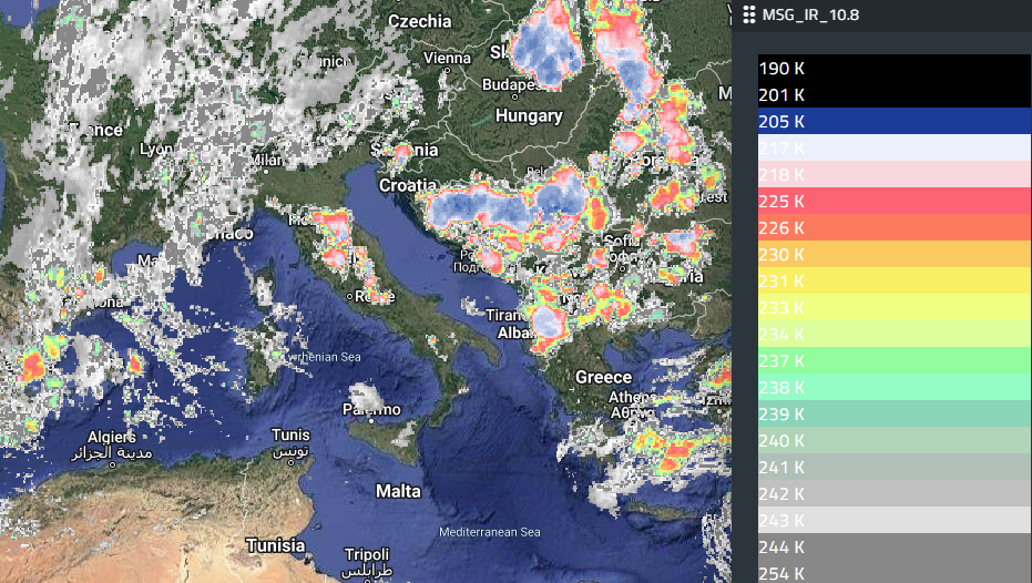 MSG (Meteosat Second Generation) è un progetto di ESA (Agenzia Spaziale Europea) ed EUMETSAT e fa seguito al successo della prima generazione Meteosat con satelliti di più alte prestazioni. Esso mantiene e produce un sistema Europeo di satelliti meteorologici. Al momento sono pianificati quattro satelliti e un segmento terrestre. L’ESA è responsabile per il disegno e lo sviluppo del primo satellite (ora già in orbita) e per l’approvvigionamento degli altri tre a metà con EUMETSAT. Il primo satellite, MSG-1 è stato lanciato nell’Agosto 2002. MSG-2 è stato lanciato nel dicembre 2005. Gli altri sono stati lanciati successivamente (2011-2013). Ogni satellite ha un tempo di vita nominale di sette anni. Il terzo e quarto satellite MSG dello stesso disegno sono previsti per assicurare continuità del servizio fino alla fine della prossima decade. Con il lancio di MSG-2, in qualsiasi momento, due satelliti MSG sono funzionali in orbita geostazionaria, uno opera a 0 gradi di longitudine sopra l’Africa equatoriale ovest mentre l’altro è in riserva. La seconda generazione MeteoSat è stata progettata per rispondere alle diverse esigenze degli utenti coinvolti nelle applicazioni di nowcasting e nello sviluppo di modelli numerici per le previsioni meteo, inoltre fornirà importanti dati per il monitoraggio del clima che saranno utili per individuare rapidamente fenomeni meteorologici che potrebbero evolvere in eventi devastanti. La seconda generazione di Meteosat riprende immagini a lunghezze d’onda maggiori e ad intervalli più stretti rispetto ai suoi predecessori, rendendola particolarmente appropriata per le previsioni a breve termine di inaspettati e fastidiosi fenomeni atmosferici come neve, temporali e nebbia. Di default, viene visualizzata l’ultima immagine disponibile del Satellite MSG (Meteosat Second Generation) nel canale dell’Infrarosso 10.8mm. Sono selezionabili le immagini disponibili ogni quarto d’ora nel Time Range di riferimento fissato con una risoluzione spaziale di circa 3km. |