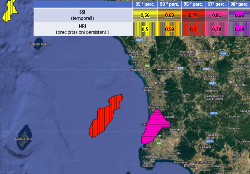 Tali Prodotti sono il risultato dell’analisi di gran parte dei prodotti standard generati dalle varie catene operative presso il CFC; pertanto, anche la frequenza operativa della schedula HR è 5 minuti, resa disponibile con un ritardo di visualizzazione, rispetto al tempo nominale, di circa 10 min. L’obiettivo finale è quello di disseminare messaggi di Warning durante il verificarsi di un fenomeno meteorologico potenzialmente pericoloso. Inoltre, laddove possibile, si tenta di prevedere l’evoluzione futura del fenomeno stesso con un discreto margine di anticipo. Il prodotto HRD ha lo scopo di individuare singole aree (poligoni) potenzialmente a rischio. La determinazione dei poligoni si basa sull’algoritmo IDL denominato CONTOUR: tale algoritmo ricerca aree omogenee rispetto ad un parametro di riferimento ed un valore di soglia predefinito. Attualmente la ricerca si basa su aree caratterizzate da precipitazione istantanea (SRI) superiore a 10 mm/h (parametro threshold). Lo shapefile associato al prodotto contiene la lista delle coordinate che delimitano i poligoni individuati. Allo scopo di evitare un numero eccessivo di poligoni vengono escluse aree troppo piccole (min_area = 20 kmq). Inoltre, vengono filtrate aree eccessivamente estese (max_area = 10000 kmq). Analogamente al Prodotto HRW, le informazioni contenute nello shapefile si riferiscono al valore massimo di HRI, SSI e di tutte le Features registrate su ogni area. Si assume che ogni poligono, rappresentativo di un fenomeno precipitativo, si sposti nella direzione e con la velocità rilevate dal prodotto AMV: tale prodotto è il risultato del campionamento dei valori puntuali contenuti nel prodotto satellitare MPEF (Meteorological Products Extraction Facility) denominato AMV (Atmospheric Motion Vector), su una griglia di 50x50 km2. In fase di visualizzazione del prodotti, ad ogni evento viene associata una classe, e quindi un colore, in funzione dell’indice di severità. La classe dell’evento si riferisce al valore massimo (maxInd) tra HRI e SSI. Le etichette e i colori della legenda corrispondono alle seguenti soglie di severità (percentili): ![]() Per informazioni di maggior dettaglio, si suggerisce di consultare l'approfondimento scaricabile cliccando il seguente link: Prodotti Heavy Rain su Dewetra |