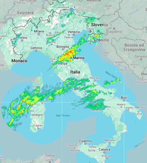 Strumento per la visualizzazione delle variabili istantanee del mosaico della Rete Radar Nazionale. Le informazioni visualizzate provengono dai diversi radar e sono rielaborate e mosaicate a Roma su tutta Italia; non è possibile separare i dati di un singolo radar. La variabile che appare di default è la Vertical Maximum Intensity (dBZ) ovverosia il massimo della riflettività osservata alle quote 2, 3, e 5km. L’immagine di VMI è quella riferita all’ultimo istante osservativo disponibile. Il prodotto VMI ha la caratteristica di contenere una matrice di qualità. Assegnare un valore alla presunta bontà della stima risulta essere determinante soprattutto in fase di mosaicatura.