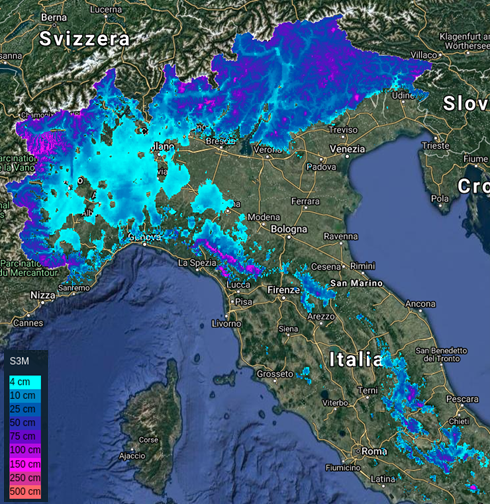 S3M è un modello di stima della copertura ed equivalente idrico nivale a scala nazionale con una risoluzione spaziale di 200 x 200 metri (circa) e una risoluzione temporale di un’ora. I dati in input includono temperatura dell’aria, umidità relativa e radiazione incidente provenienti dalla rete di telemisura nazionale, uniti alle mappe di precipitazione output del Modified Conditional Merging tra dati a terra e rete radar (MCM). Questi dati vengono usati per forzare S3M, un modello che fornisce stime spazialmente distribuite di equivalente idrico della neve, altezza del manto nevoso, densità media, contenuto liquido del manto e fusione nivale e glaciale. Tra Dicembre e Aprile, vengono assimilate anche mappe di altezza di neve ottenute interpolando I dati dei nivometri della rete nazionale (tenendo conto della topografia) e mappe di copertura nevosa ottenute mediante una procedura di data blending tra I dati di Sentinel 2, di MODIS, e di H-SAF (prodotto H10). La versione attuale di S3M Italia è stata inizializzata nel corso di Giugno 2021 in una condizione di sostanziale assenza di copertura nevosa su tutto il territorio italiano (ad esclusione dei ghiacciai alpini). Da tale data è iniziata la procedura di produzione delle mappe a scala nazionale, che sono disponibili su Dewetra nella versione attuale da Novembre 2021. Operativamente S3M viene eseguito in tempo reale, una volta all’ora, con aggiornamento del dato su Dewetra nel corso della notte. Le immagini MODIS sono disponibili con qualche giorno di ritardo per cui, quotidianamente, il run copre un periodo di 4 giorni precedenti alla data di lancio. Viene pubblicata una mappa al giorno. Per ulteriori informazioni, è disponibile la seguente pubblicazione online |