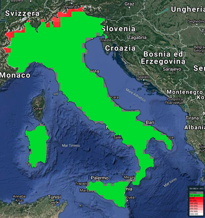 SN OBS 4 - H13, meglio noto come SWE-E, è un prodotto di Equivalente Idrico Nivale dell’iniziativa H-SAF di Eumetsat (https://hsaf.meteoam.it/Products/Detail?prod=h13). L’approccio di stima si basa sulla radiometria a mocroonde. Il prodotto riporta, per ogni pixel, la stima del quantitativo di acqua equivalente contenuta dalla coltre nivale, in mm. Il prodotto ha granularità giornarliera e risoluzioni nell’ordine di 10-30 km (in base all’area di interesse in Europa, con risoluzione crescente con la latitudine).