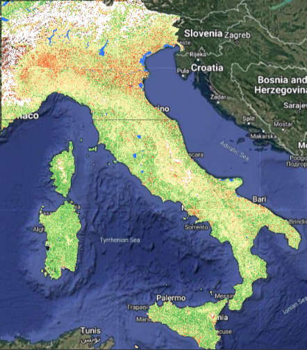 L’indice NDVI è uno strumento semplice ma efficace per quantificare la presenza di clorofilla della vegetazione, e di converso il livello di secchezza della stessa. Le piante verdi vive appaiono relativamente scure nella regione spettrale della radiazione fotosinteticamente attiva (PAR), e relativamente luminose nel vicino infrarosso. Il pigmento delle foglie delle piante, la clorofilla, assorbe fortemente la luce visibile (da 0,4 a 0,7 nm) per l'uso nella fotosintesi. La struttura cellulare delle foglie, invece, riflette fortemente la luce nel vicino infrarosso (da 0,7 a 1,1 nm). Più foglie ha una pianta, più queste lunghezze d'onda della luce sono influenzate, rispettivamente. L'intervallo di valori di NDVI è compreso tra -1 e 1. I valori negativi di NDVI (valori prossimi a -1) corrispondono all'acqua. I valori prossimi allo zero (da -0,1 a 0,1) corrispondono generalmente ad aree aride di roccia, sabbia o neve. Valori bassi e positivi rappresentano arbusti e prati (da 0,2 a 0,4 circa), mentre valori alti indicano foreste pluviali temperate e tropicali (valori prossimi a 1). Esso rappresenta un buon proxy per identificare la quantità di vegetazione verde viva. L'indice di vegetazione differenziale normalizzato, abbreviato NDVI, è definito come ( Red - NIR) / (Red + NIR) Dove Red e NIR rappresentano le misurazioni della riflettanza spettrale acquisite rispettivamente nelle regioni del rosso (visibile) e dell’infrarosso vicino. (B8 - B4) / (B8 + B4) L’indice NDWI (Normalized Difference Water Index) introdotto da Gao nel 1996 [3] viene utilizzato per monitorare i cambiamenti nel contenuto d'acqua delle foglie, utilizzando le lunghezze d'onda dell’infrarosso vicino (NIR) e dell'infrarosso a onde corte (SWIR). Tale indice può essere definito come: (NIR - SWIR) / (NIR + SWIR). Il prodotto disponibile è l'NDVI da satellite Sentinel 2 a 20 metri di risoluzione, ultimo aggiornamento disponibile ottenuto da mosaicature. Per ulteriori informazioni:
