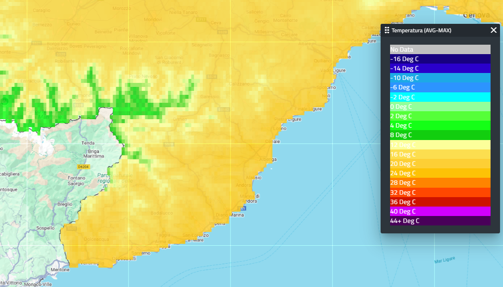 | Descrizione | Strumento per la visualizzazione delle temperature osservate registrate dai termometri a terra[1]. I dati puntuali sono interpolati nello spazio tramite il metodo della regressione lineare. E' possibile la visualizzazione dei valori massimi e minimi medi mensili della temperatura. E’ inoltre possibile fissare una soglia minima di temperatura per visualizzare Solamente le zone in cui si eccede tale temperatura. | |