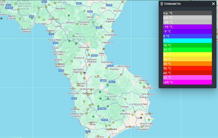 | Descrizione | Questo layer mostra i sensori della rete termometrica fiduciaria del Dipartimento della Protezione Civile Nazionale[1]. I marker vengono colorati in coerenza alla palette della mappa di temperatura, riportando in questo modo l'informazione circa le misure termometriche effettuate dai sensori a terra. | |