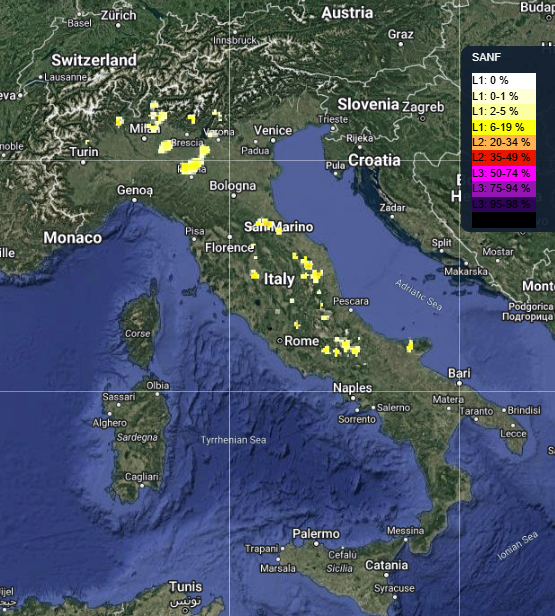 SANF è un sistema di allerta per frane pluvio-indotte basato sul confronto tra misure e stime di precipitazione e soglie pluviometriche empiriche elaborato da CNR-IRPI. Il sistema è costituito da tre blocchi principali: (i) il primo per l’inserimento e la memorizzazione dei dati; (ii) il secondo per l’esecuzione di algoritmi e (iii) il terzo per la generazione e la distribuzione degli output. SANF è composto da tre blocchi principali. Il primo blocco consiste in un insieme di procedure per l’importazione delle misure e delle stime quantitative della precipitazione. Ogni ora il sistema acquisisce, memorizza e valida i dati di pioggia misurati da oltre 2500 pluviometri della rete del Dipartimento della Protezione Civile. Ogni dodici ore, il sistema acquisisce previsioni quantitative di pioggia per le successive 72 ore da un modello di previsione a scala locale (modello LAMI). Il secondo blocco consiste in un insieme di procedure per confrontare le piogge misurate e/o previste con un set di soglie pluviometriche e per calcolare la probabilità di occorrenza delle frane. Il terzo blocco consiste in un insieme di procedure per generare e distribuire mappe di previsione a scala sinottica, che mostrano i livelli di criticità per la possibile occorrenza di frane pluvio-indotte. Le mappe prodotte sono rese disponibili sotto forma di servizi WMS (Web Map Service) e WFS (Web Feature Service) conformi agli standard definiti dall’OGC (Open Geospatial Consortium). SANF utilizza esclusivamente software Open Source. Documentazione ufficiale del prodotto: https://www.irpi.cnr.it/product-service/sanf/ |