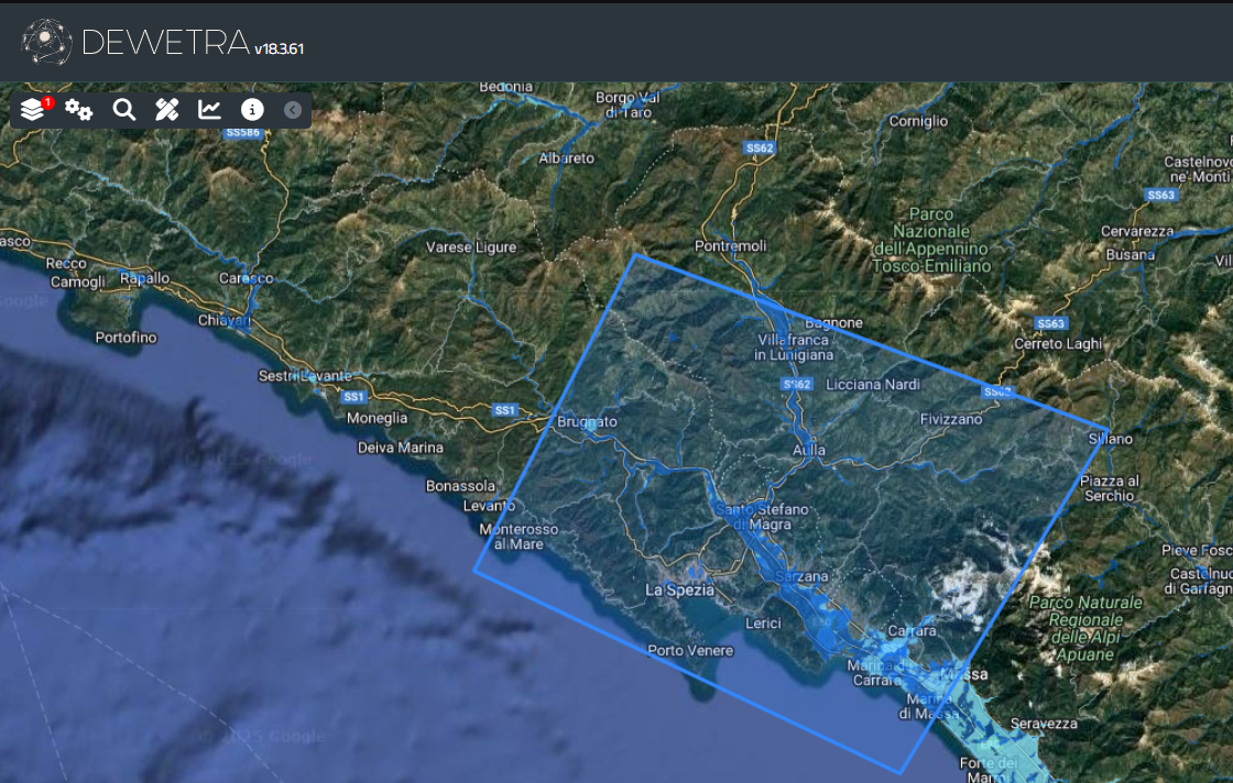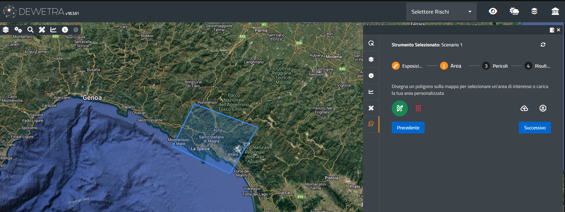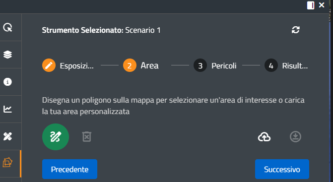 La pressione del pulsante Successivo sblocca la funzionalità di disegno che consente all'utente di tracciare un poligono ovvero di caricare un file vettoriale che contenga un poligono in base al quale delimitare l'area d'indagine: