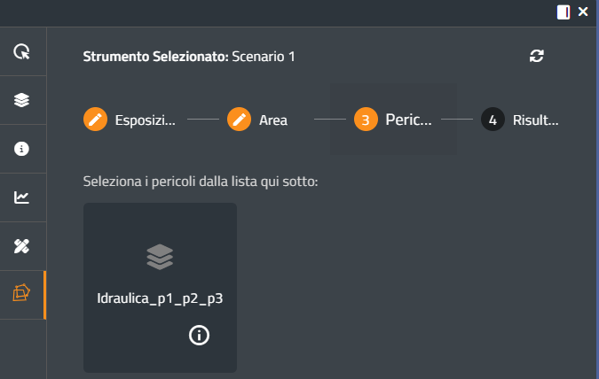 Lo strumento Analisi degli Esposti consente l'eleborazione speditiva di uno scenario di rischio basato sulla selezione di un'area di indagine (AOI), di una lista di elementi esposti e di un livello di periocolosità idraulica o geologica.