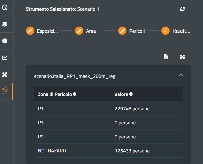 Premendo nuovamente il pulsante Successivo, il sistema calcolerà e mostrerà a video il risultato dell'analisi, suddiviso per classi di rischio (compresi anche gli esposti che ricadono al di fuori delle fasce di pericolosità (nell'esempio, la popolazione complessiva)