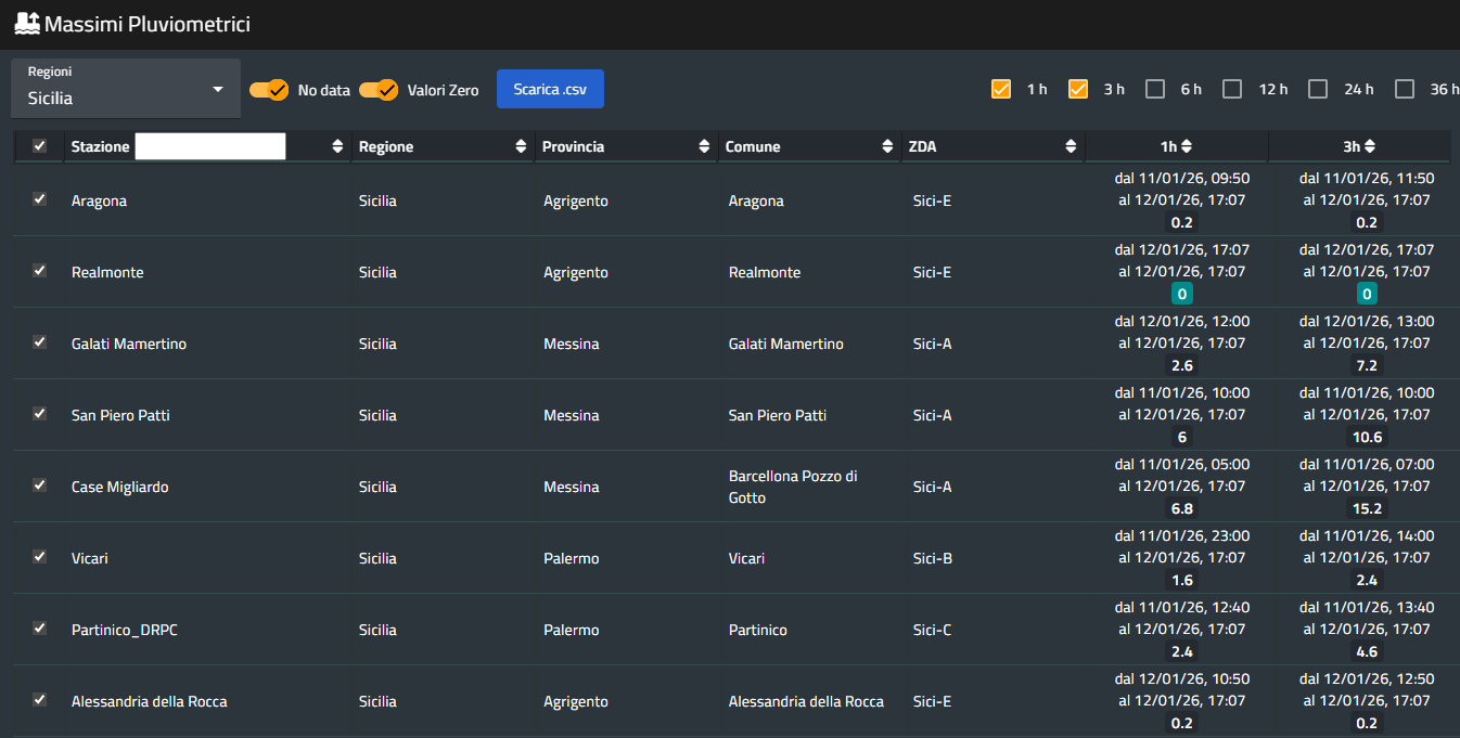 Una volta effettuato l'accesso, la dashboard dell'applicativo mostrerà tutti i massimi osservati, in tempo reale e a finestra mobile, dai sensori della rete fiduciaria: