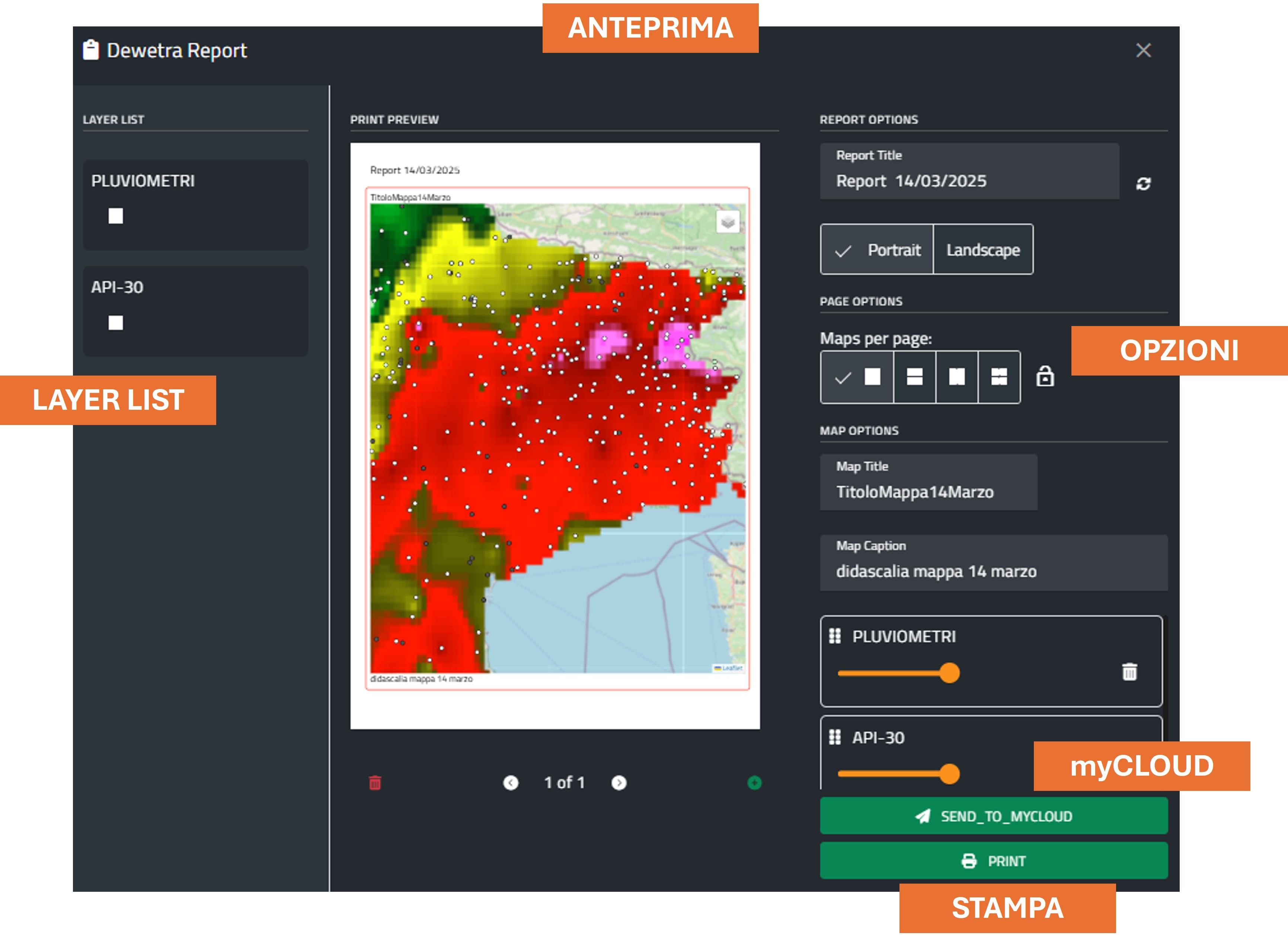 Questo strumento permette la creazione di un rapporto in formato .pdf partendo dalla configurazione impostata nel controllo mappa ovverosia dai layer presenti all'interno della layer list.