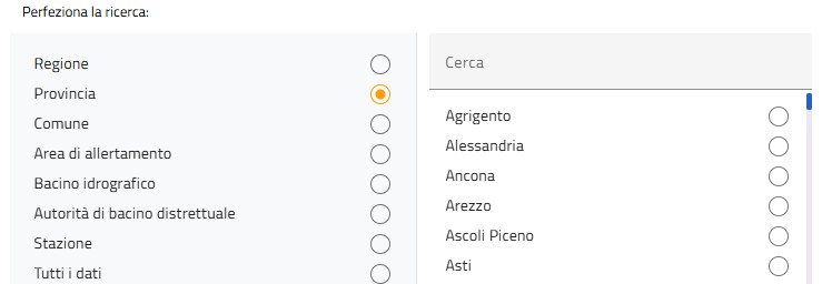 La seleziona di una delle voci riportate nella figura precedente determinerà l'apertura di un secondo menu attraverso il quale l'utente potrà ulteriormente rifinire la query: nel caso d'esempio, dopo la selezione del livello provinciale, l'utente dovrà quindi scegliere la provincia della quale scaricare i dati