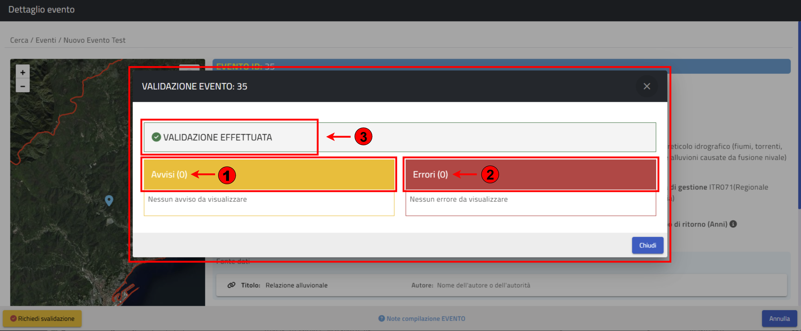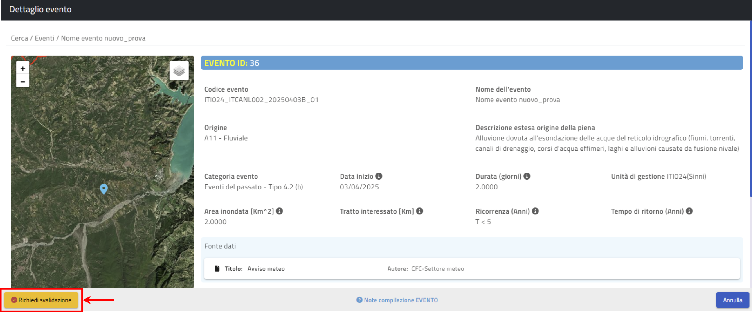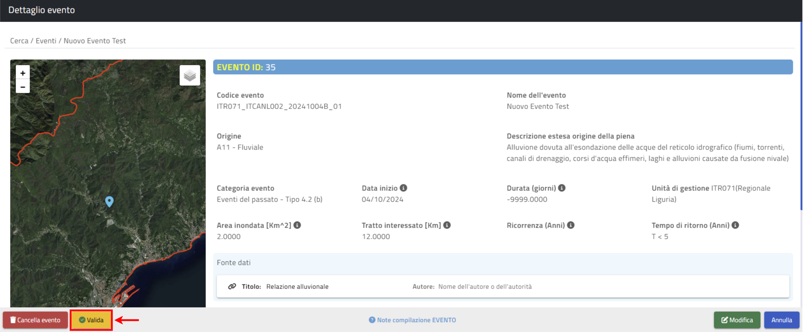 La Validazione è avviata tramite il pulsante visibile in basso a sinistra sulla scheda “Dettaglio Evento”.