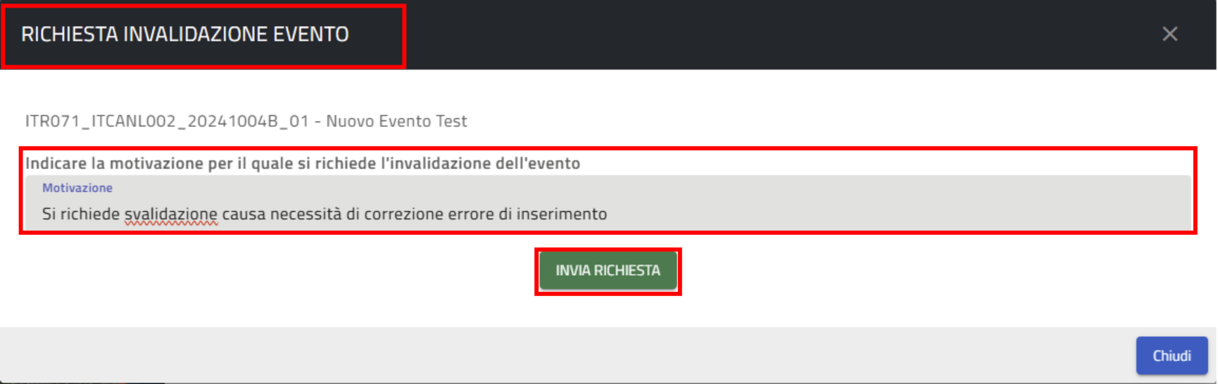 Premuto il tasto “Richiedi svalidazione” si apre un popup con la maschera di “Richiesta invalidazione evento”; una volta compilata questa maschera, specificando la motivazione della richiesta, si attiva il tasto di conferma “Invio Richiesta”.
