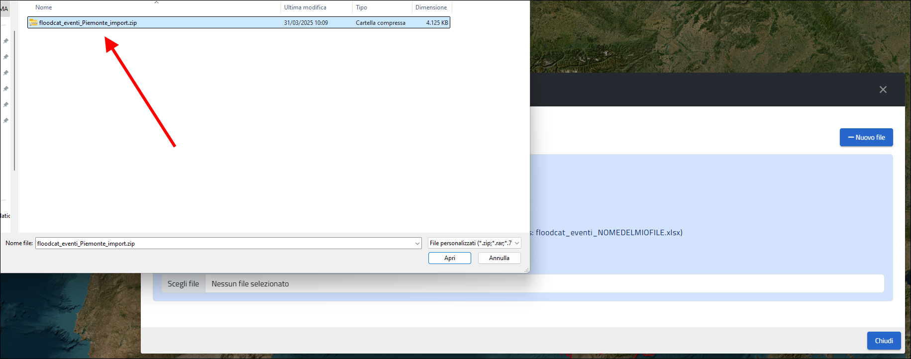 Il sistema attiva quindi la finestra attraverso la quale si seleziona il file in formato ZIP che contiene i dati che si vuole importare rispettando i seguenti requisiti: