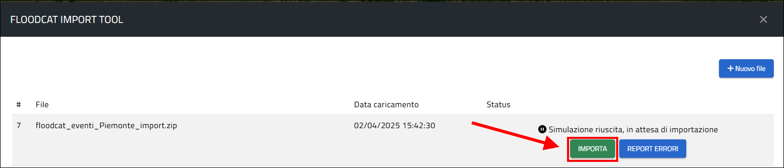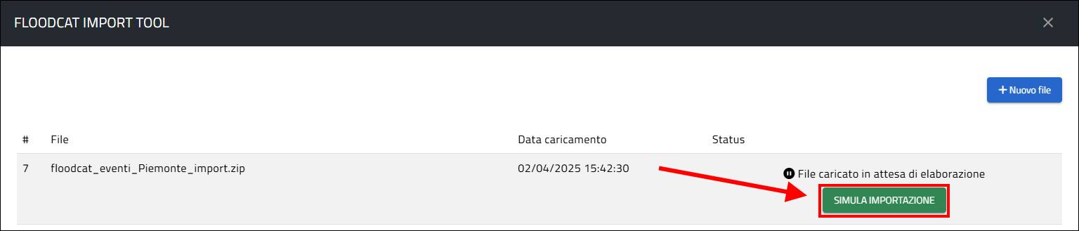 La selezione del file, premendo il pulsante Apri sulla finestra di selezione del sistema, avvia automaticamente il caricamento del file ZIP al cui termine sulla finestra FLOODCAT IMPORT TOOL che riporta il risultato dell'importazione; se il processo di caricamento termina correttamente, nella sezione Status, compare il messaggio File caricato in attesa di elaborazione e si può quindi procedere alla simulazione dell'importazione premendo il pulsante SIMULA IMPORTAZIONE: