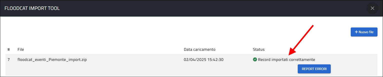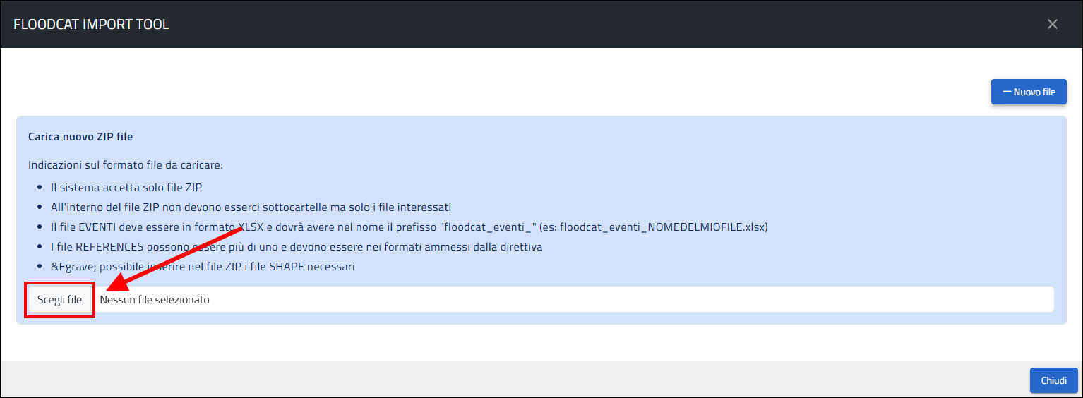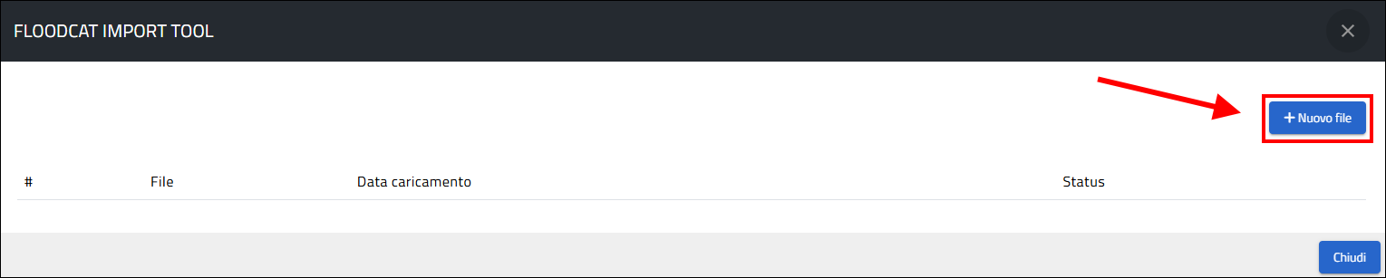 Una volta premuto il pulsante si apre la finestra FLOODCAT IMPORT TOOL attraverso la quale si può avviare la procedura per il caricamento massivo premendo il pulsante Nuovo file e, di seguito, Segli file :