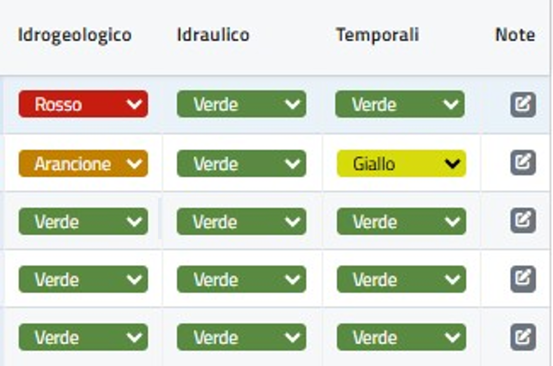 Le tre colonne rappresentate in figura mostrano i livelli di criticità calcolati dal sistema per i 3 rischi idrogeologico, idraulico e idrogeologico per temporali.