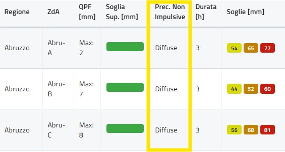 In questa colonna (Prec. Non Impulsive) vengono inserite le tipologie dei fenomeni non impulsive inseriti manualmente ovvero desunti da modello di previsione, secondo le classi previste (assenti, isolate, sparse, diffuse).