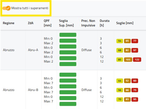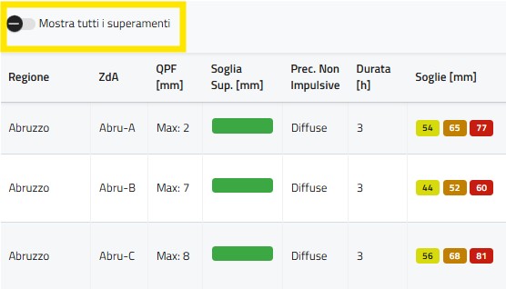 Come riportato in figura, di default il sistema mostra nella colonna QPF (mm) solo il valore massimo inserito dall’utente: spostando però il toggle Mostra tutti i superamenti in posizione ON (a destra), la dashboard visualizzerà, come riportato nella figura successiva, anche il valore minimo e l’eventuale relativo superamento di soglia pluviometrica nella corrispondente colonna.