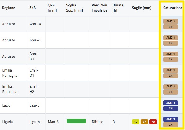 In questa colonna (Saturazione) vengono riportati i livelli di saturazione del suolo, stimati mediante il calcolo degli indici AMC (antecedent moisture conditions) e Cancelli-Nova, i cui valori vengono mediati sulla singola zona d’allerta.