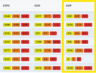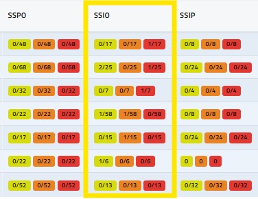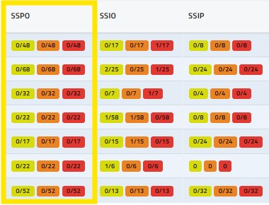In questa colonna (SSPO) il sistema riporta i superamenti pluviometrici osservati per ogni zona d’allerta nelle ultime n-ore: di default il sistema mostra i superamenti avvenuti nell’ultima ora, ma agendo opportunamente sul menu a tendina Superamenti Osservati, l’utente può richiedere il calcolo sulle ultime 3, 6, 12 e 24 ore. I superamenti così calcolati vengono rappresentati riportandone, all’interno di un box campito secondo l’associazione ai codice colore vigenti nell’attuale sistema di allertamento, il valore numerico su sfondo colorato in maniera coerente con il valore di soglia superato.