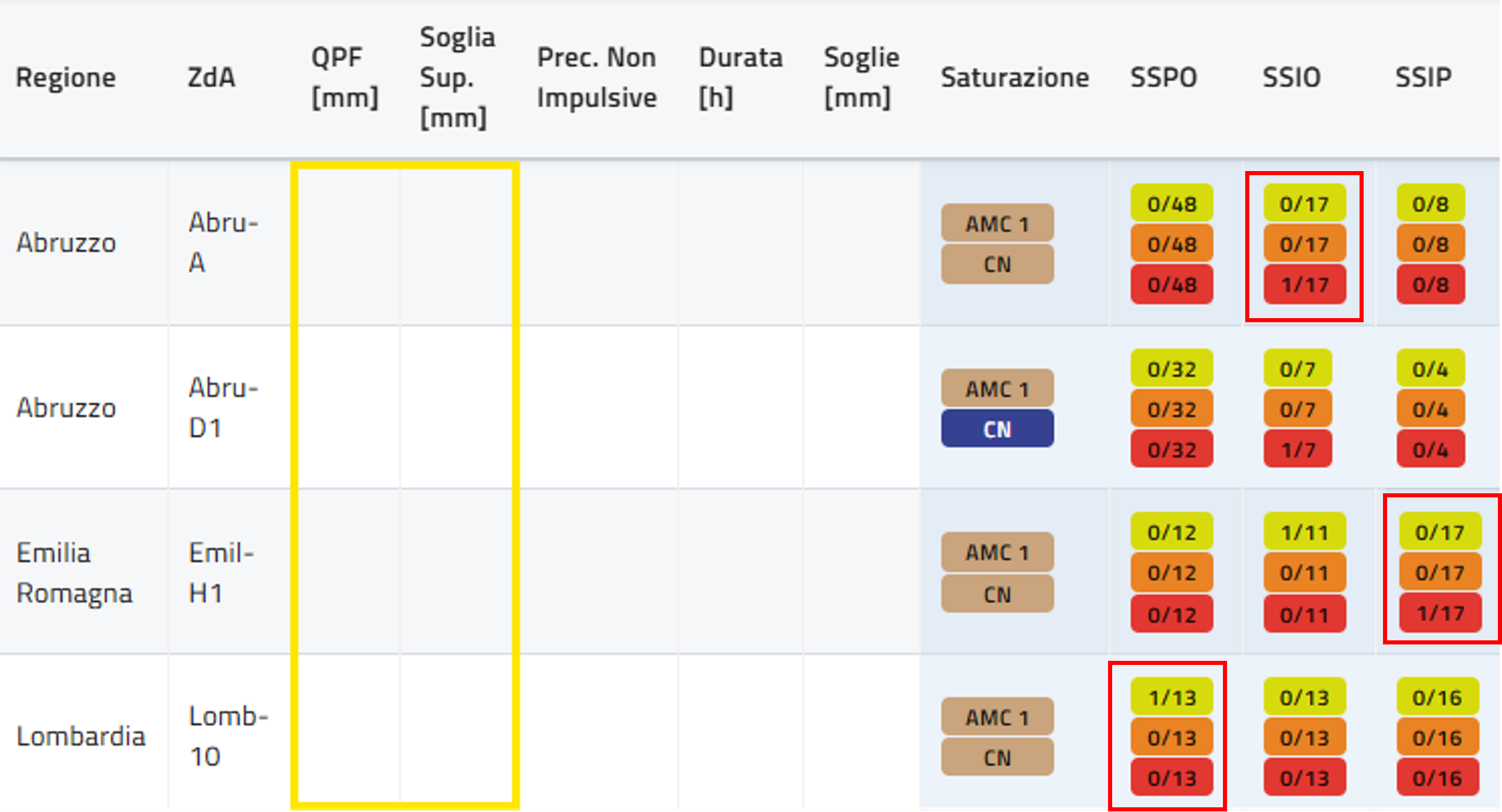 Può talvolta capitare che, anche per le zone d’allerta per le quali non è stata inserita una QPF, si verifichino superamenti di soglia pluviometrica osservata (SSPO) e/o di soglia idrometrica osservata e/o prevista (SSIO e/o SSIP): in tal caso (cfr. figura successiva), nella tabella compariranno uno o più record in cui i campi QPF, Soglia Sup, Durata e Soglie risulteranno vuoti (riquadro giallo) mentre comparirà il numero di SSPO, SSIO e SSIP (riquadri rossi).