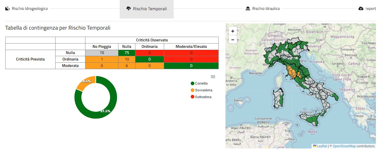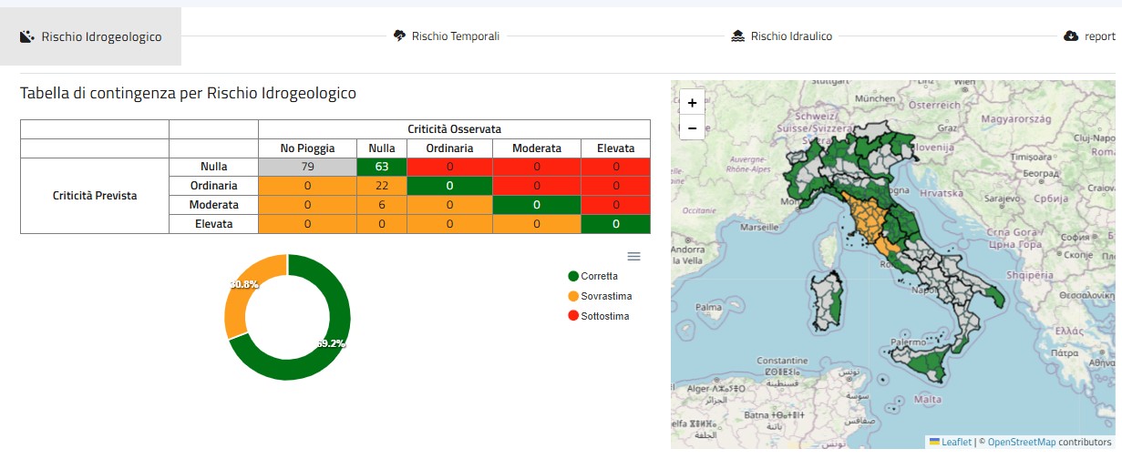 Una volta effettuato l'accesso al modulo Analisi, il sistema mostra una dashboard nella quale vengono rappresentati i risultati, sia in forma tabellare che in mappa, della verifica della previsione secondo i criteri esposti nella sezione dedicata. I risultati summenzionati sono suddivisi per tipo di criticità: