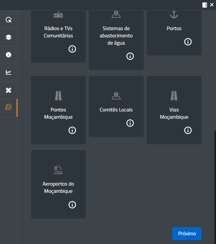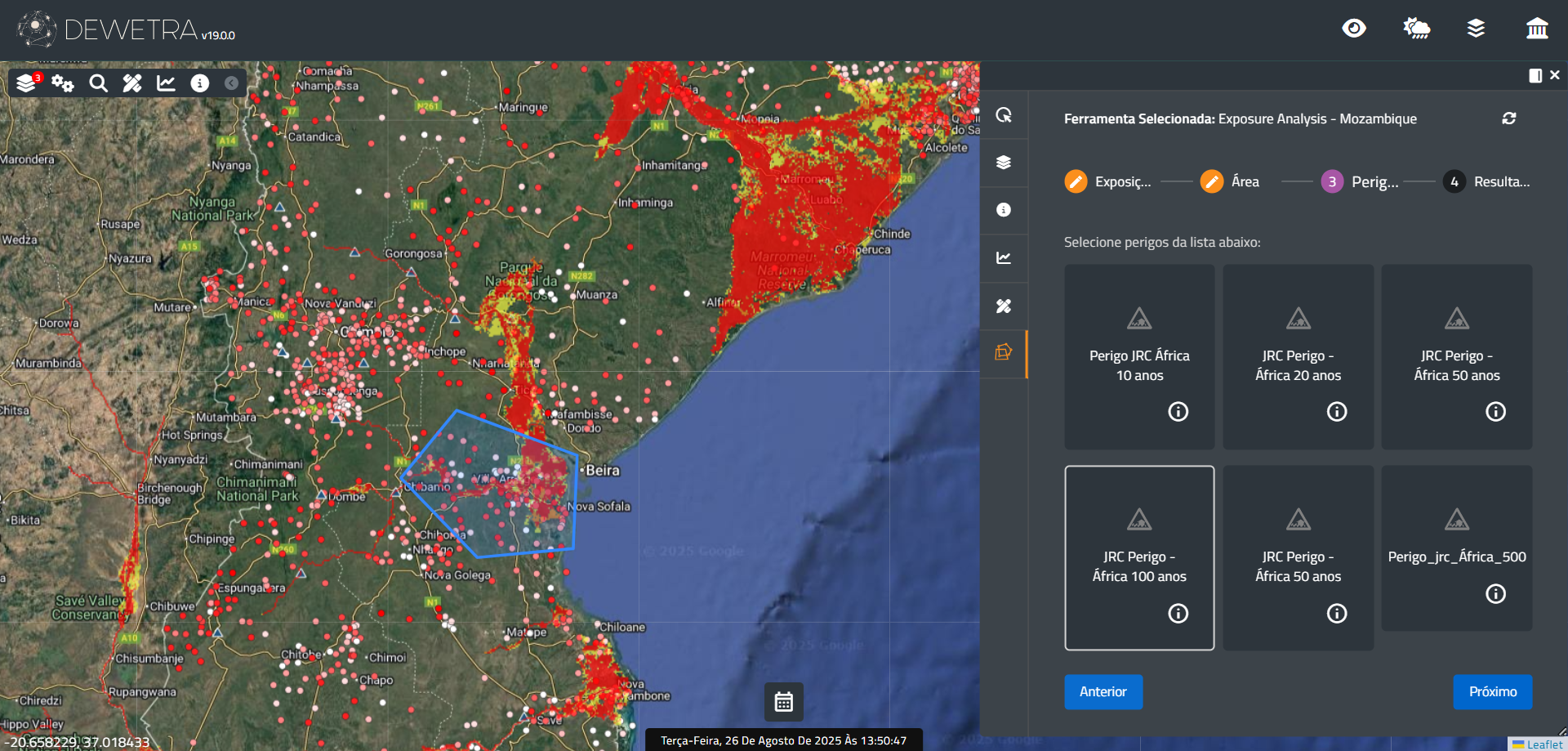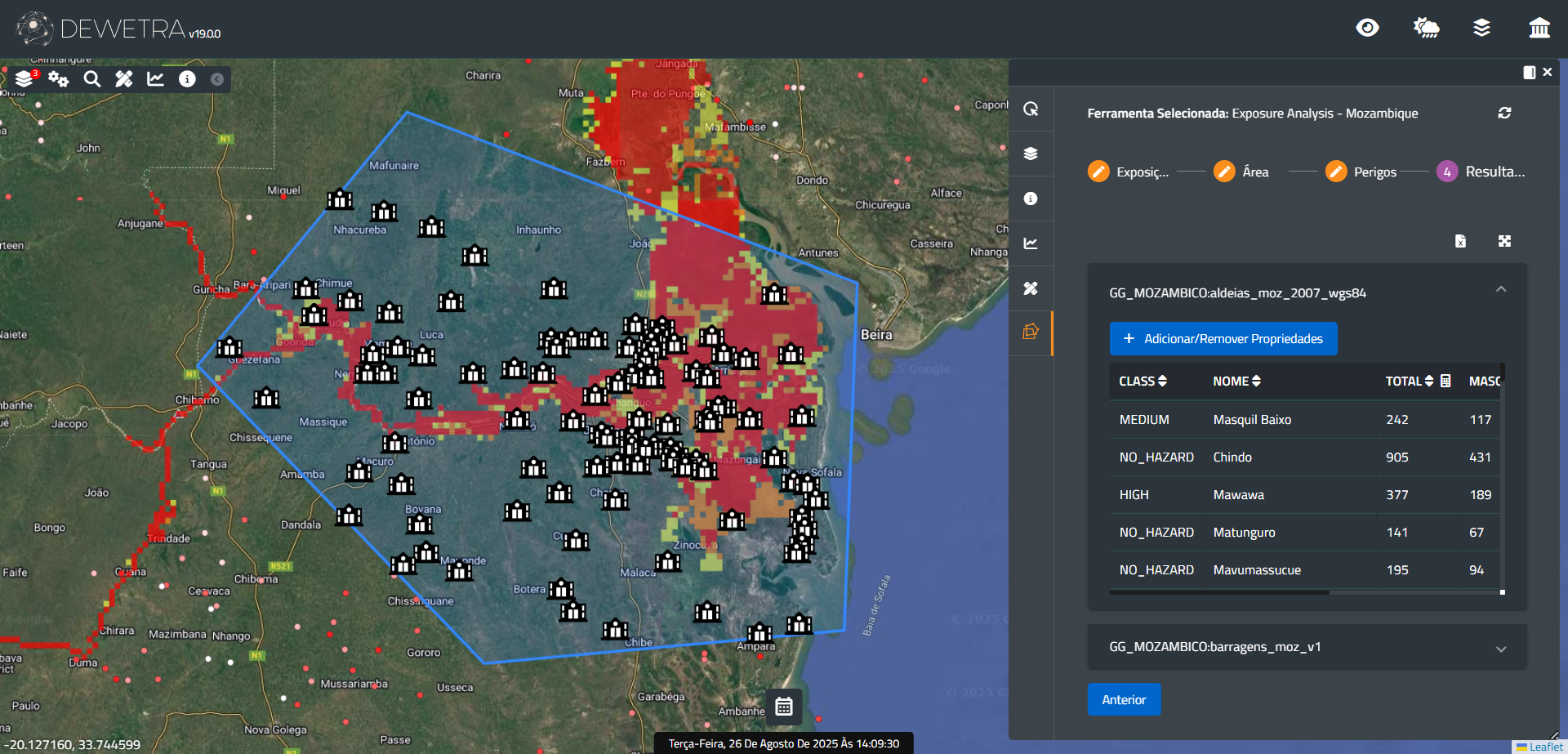 Na última seção, uma lista dos recursos disponíveis para cada exposição será solicitada, conforme a figura abaixo. No exemplo, os hospitais de Moçambique enquadrados na AOI são listados no painel direito com algumas informações úteis: seu distrito e província, o nome do hospital e a classe de perigo em relação aos mapas de perigo selecionados.
