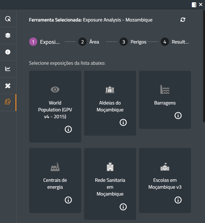 O utilizador pode conceber um cenário de risco abrangente através do painel de controlo Análise da exposição (ver figura abaixo). Neste campo, clica no botão “Exposure Analysis – Mozambique” e o sistema irá direciona-lo para uma outra página.